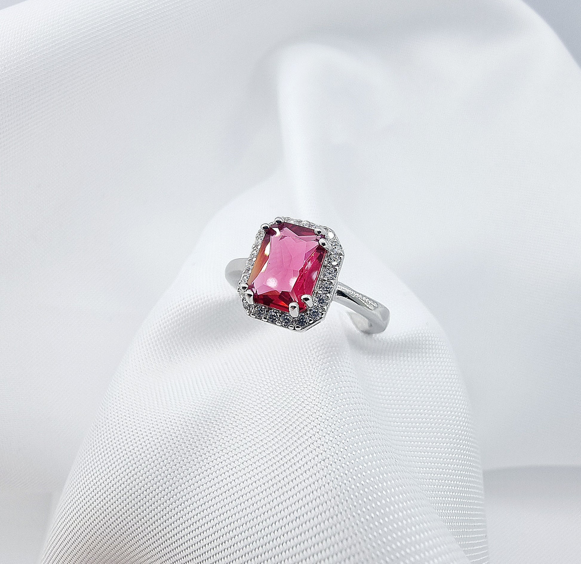 Anello in argento 925 rodiato, caratterizzato da uno zircone naturale con taglio rettangolare a gradini, montato a griffe.